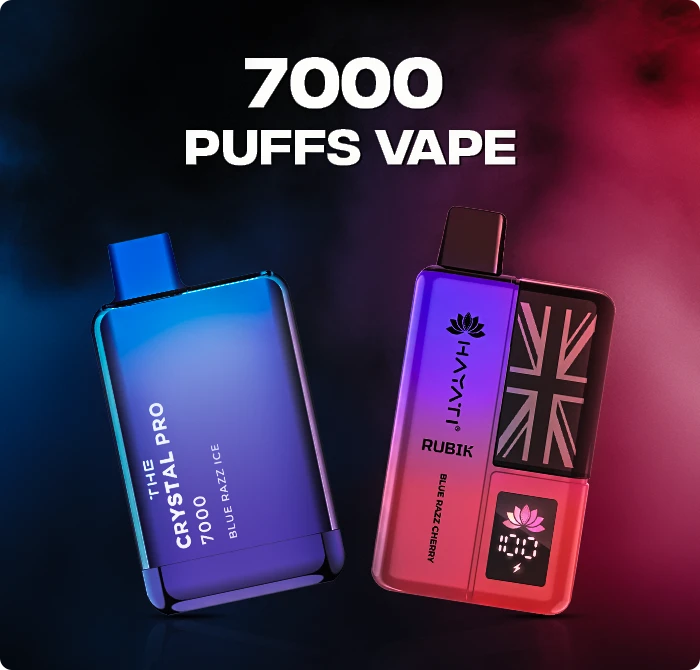 7000 puffs from some popular and best brands in the UK, including Hayati, Lost Mary, RandM Tornado, and more. Modern coil systems and larger e-liquid