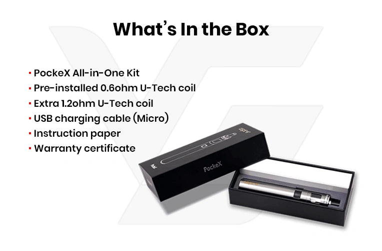 - Unbox the kit and check that you have the PockeX device, a 0.6Ω coil, a 1.2Ω coil, a USB charging cable, and the user manual.