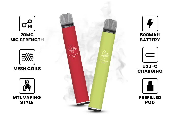 Transition to a ban-free yet convenient vaping with the Elf Bar 600 Prefilled Pod Kit. A sleek and lightweight rechargeable device paired with prefilled pods. It's the perfect combination of eco-friendly and simple vape requiring no messy refilling and uses mesh coil technology to deliver a rich (flavoury) MTL experience.