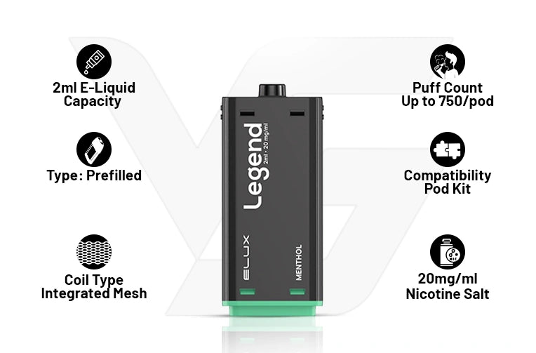 Each Legend pod is prefilled with 2ml of 20mg nicotine salt e-liquid that provides a smooth and satisfying Mouth-to-Lung (MTL) vaping experience. The integrated mesh coil technology further ensures every puff is packed with a consistent flavour.