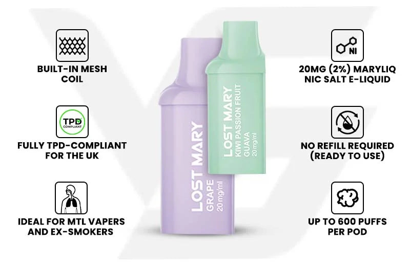 The Lost Mary BM600 prefilled pods are made for the Lost Mary BM600 Prefilled Pod Kit. You’ll find the same MaryLiq 20mg nicotine salt blend in these pods that was used in the BM600 disposables. These MTL pods use a built-in mesh coil to ensure balanced vapour output with every puff. One pod provides around 600 puffs, depending on your vaping habits.