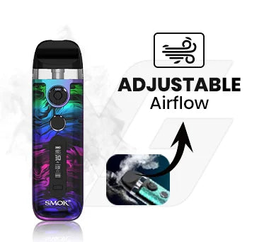 The Novo 5 pod vape system features a small, rotating dial for airflow adjustment. This unique design gives you granular control over the airflow as you can set the amount of air that enters the device just by rotating the wheel. This allows you to create your perfect draw, whether you want a restricted MTL for a strong throat hit, or a slightly less restricted MTL draw for a smoother vape.