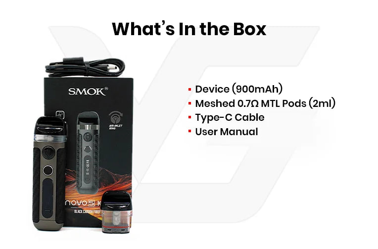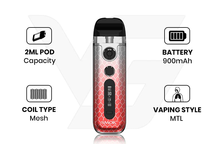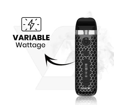 Variable Wattage The Smok Novo 5 with its 5-30 W output power gives you the freedom to experiment and find the perfect wattage for your chosen e-liquid and vaping style. A lower wattage setting, i.e., 10-12 W, provides a cooler, milder vape that conserves battery and e-liquid, while a higher wattage of up to 25W produces a warmer vape with dense clouds and intense flavour.