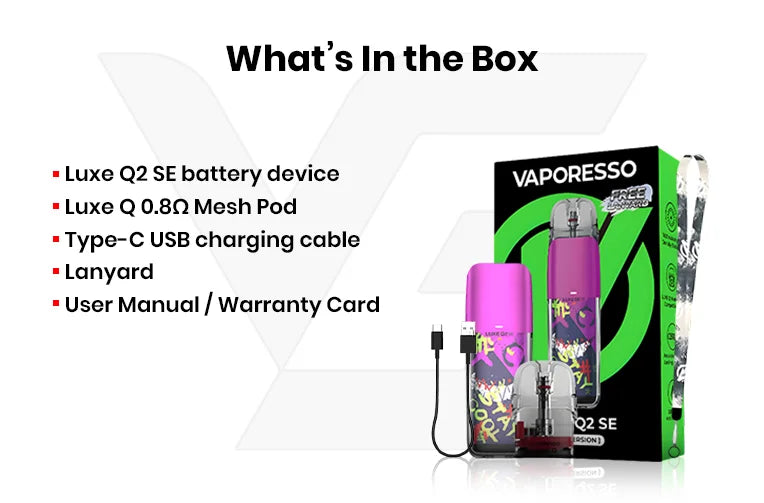 - Remove your Luxe Q2 SE kit and included pod from the box packaging.