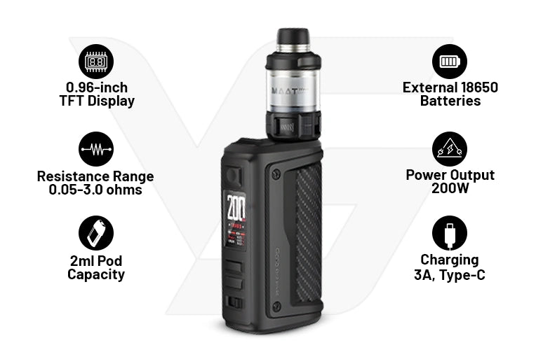 Supporting dual external 18650 batteries with 3A Type-C charging, the premium and reliable Argus GT II 200W Kit is one of the best in the VooPoo family. It offers maximum flavour delivery with dense vapour. Moreover, this VooPoo kit is made with zinc alloy and stainless steel, providing an ergonomic grip. It is compatible with the MAAT tank.
