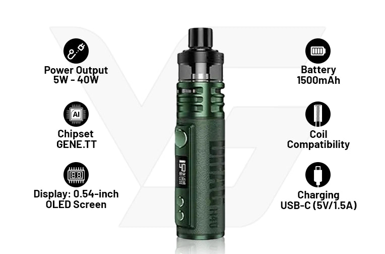 Drag H40 features a high-capacity 1500mAh internal battery with a variable power output ranging from 5W to a maximum of 40W. At its core is the GENE.TT chipset, responsible for fast ignition and a stable performance of Voopoo’s kits.